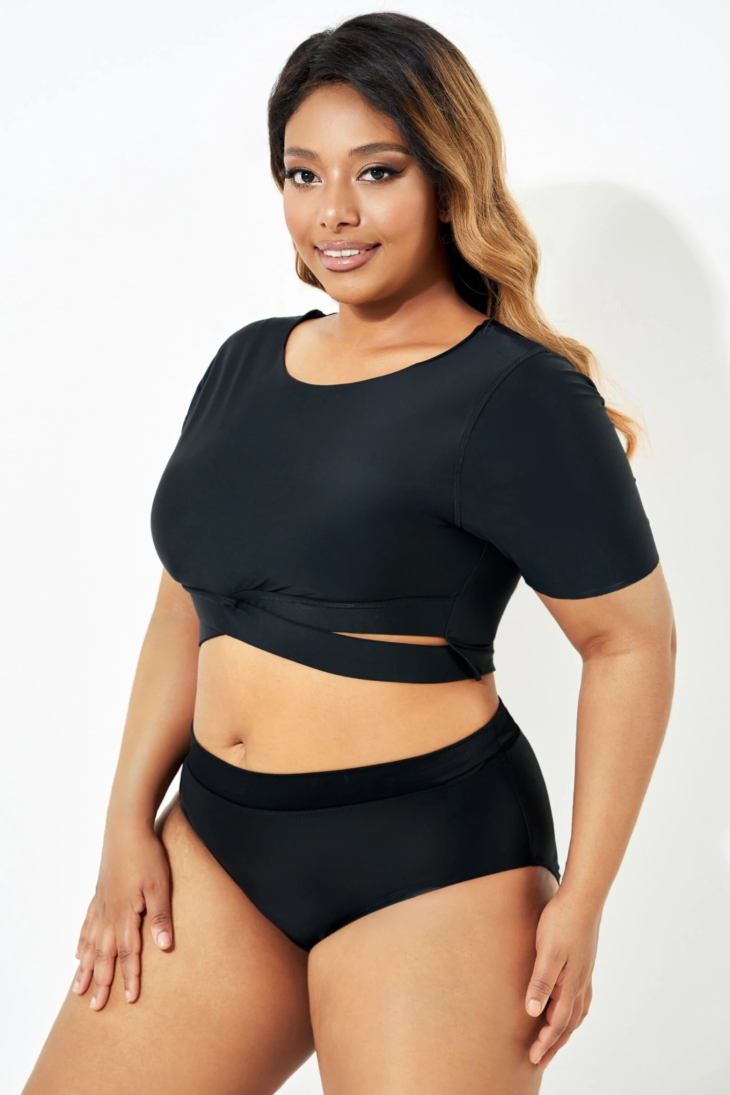 Black Cross Under The Bust Bikini Top With Sleeves